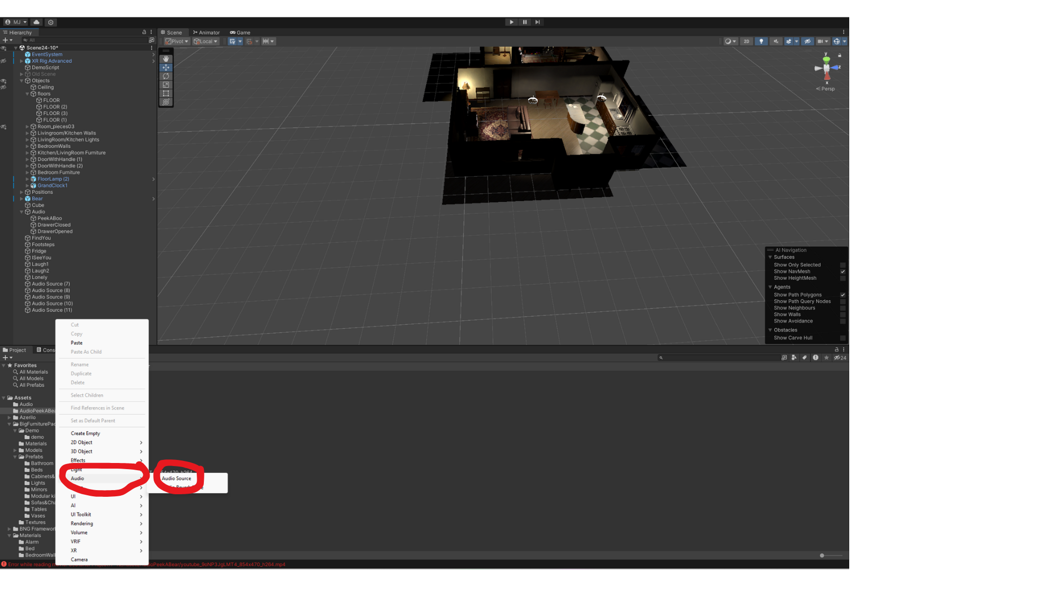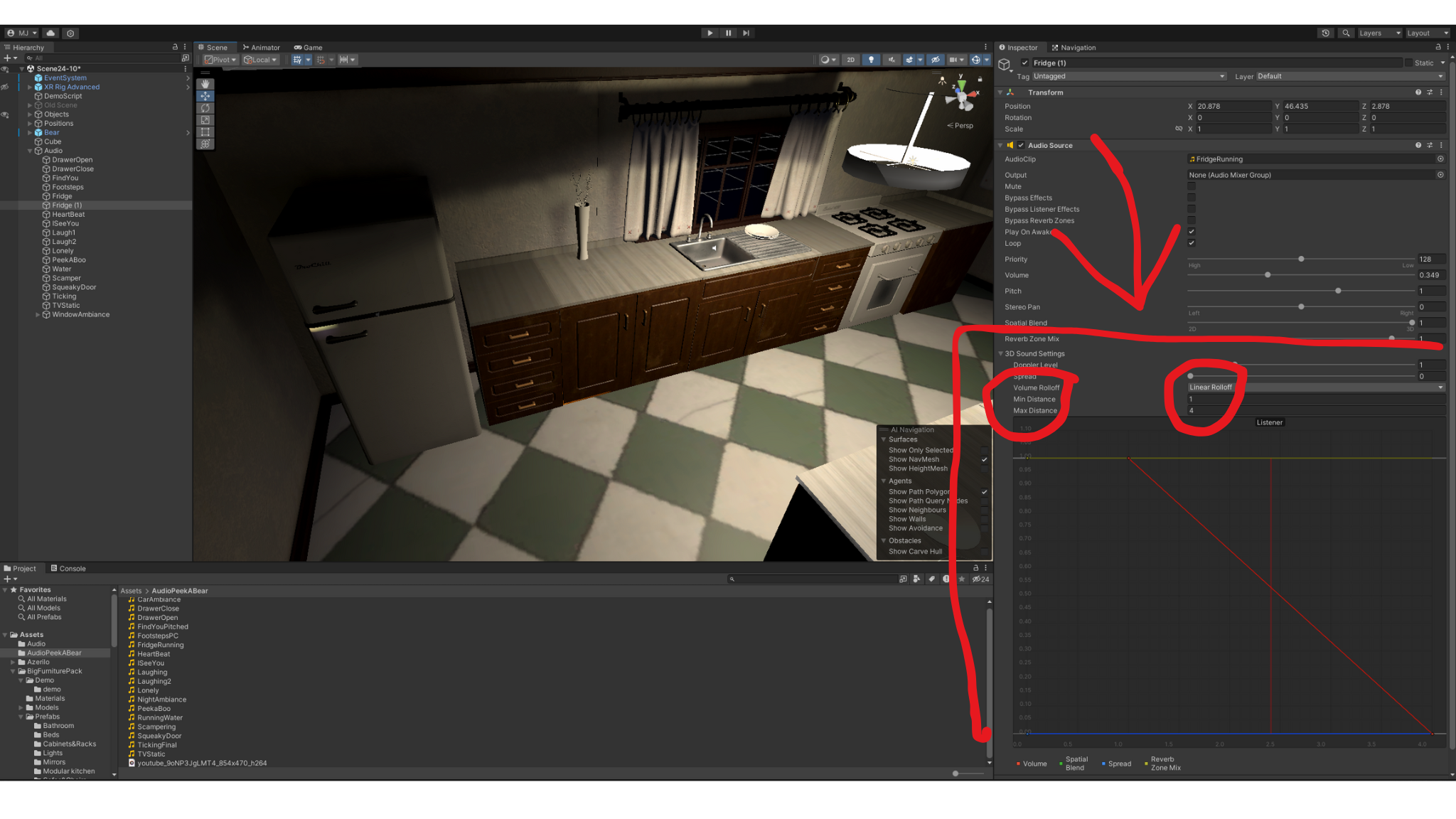 Unity makes the process of sound placement easy through its drag-and-drop design, which allowed me to create sound effects that play when the player is near, play upon certain states, or when objects are interacted with. This did come with lots of issues that needed to be resolved, including the deafening blast of every audio file playing simultaneously when the game launched. Below is a set sequential screenshots highlighting the process of sound design within Unity, along with additional explanations.
